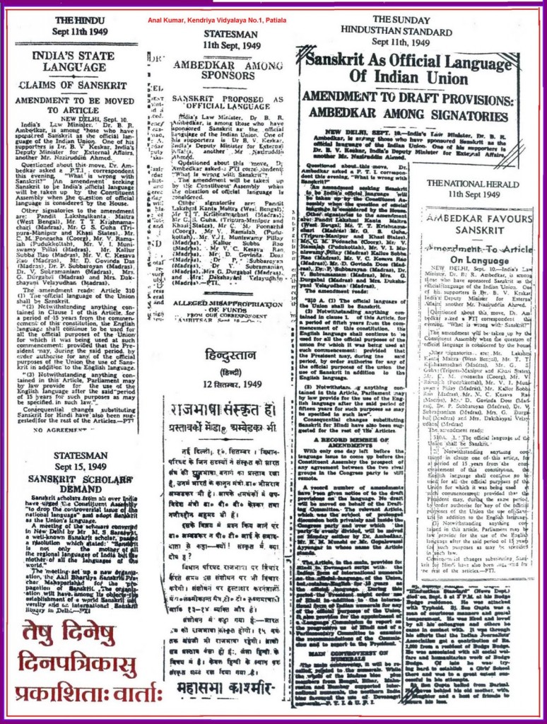 இந்தச் செய்தி அன்றைய எல்லாப் பத்திரிகைகளிலும் வெளியானது. ‘தி சண்டே ஹிந்துஸ்தான் ஸ்டாண்டர்ட்’ எனும் பத்திரிகைக்கு செப்டம்பர் 11, 1949 அன்று அளித்த பேட்டியில் பாபா சாகேப் அம்பேத்கர் பின்வருமாறு கூறினார்: ‘சட்ட அமைச்சர் எனும் முறையில் அதிகார பூர்வமாக பாரத தேசத்தின் ஆட்சி மொழியாக சமஸ்கிருதம் இருக்க வேண்டும். என நான் பாராளுமன்றத்தில் வலியுறுத்தினேன்.’ *3