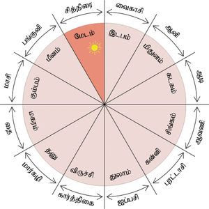 மேஷம் (ஆடு) முதலாகச் சூரியனைத் தலைமைக் கோளாகக் கொண்டு நவகோள்களும் சுற்றிவருகிற 12 வீடுகள் என்பது இதன் பொருளாகும். சூரியன் மேஷம் என்ற வீட்டில் இருக்கிற 30 நாட்களும் மேஷ ஞாயிறு எனப்படும். 27 நட்சத்திரங்களுள் சித்திரை நட்சத்திரம் துலாம் என்ற வீட்டில் அடங்கும். துலாம் என்ற வீடு, மேஷம் என்ற வீட்டிற்கு நேர் 180 பாகையில் உள்ளதாகும். எனவே மேஷம் என்ற வீட்டில் சூரியன் இருக்கையில் துலாம் என்ற வீட்டிலுள்ள சித்திரை நட்சத்திரத்துடன் சந்திரன் சேர்கிற நாளில்தான் பௌர்ணமி (முழுநிலவு) அமையும். எனவேதான் மேஷஞாயிறு என்பது பரிதிக் கணித முறைப்படியிலமைந்த பெயரென்றும் சித்திரைத் திங்கள் என்பது அதே மாதத்தை நிலவுக் கணிதத்தின் அடிப்படையில் குறிப்பிடுகிற பெயர் என்றும் கூறுவர்.