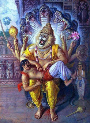 வணங்குவதற்கும் வழிபடுவதற்கும் உரியவன் நாராயணமூர்த்தி ஒருவனே என்பதில் உறுதியாக இருந்தார் பக்த ராஜாவான பிரகலாதன். இரணியன் தன் மகனை ‘இரண்யாய நமஹ’ என்று கூற ஆசை காட்டினான், அச்சுறுத்தினான், ஒரு கட்டத்தில் கொல்லவே துணிந்தான். அனைத்தையும் அவன் மகன் தன் பக்தியால் வென்று நின்றான்.