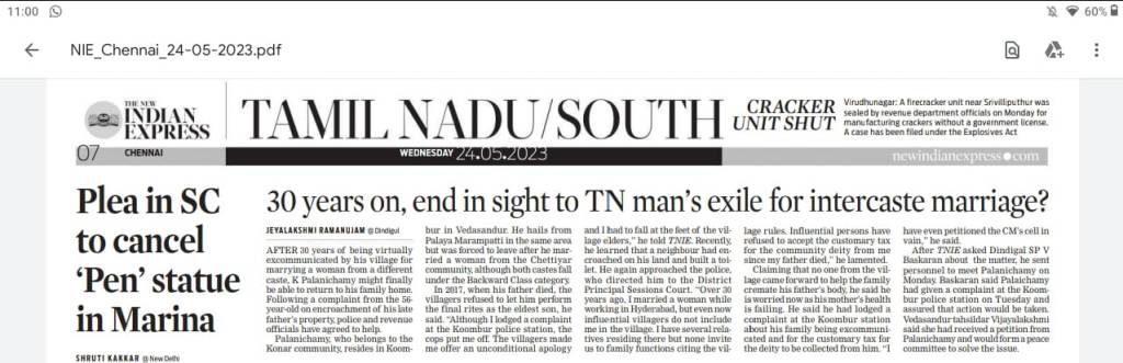 திண்டுக்கல் மாவட்டத்தில், வேடசந்தூர் அருகில் உள்ள பழைய மரம்பட்டி கிராமத்தில் பழனிசாமி என்ற கோனார் ஜாதியைச் சேர்ந்தவர் ஹைதராபாத்தில் வேலைக்குப் போனார். அங்கு செட்டியார் வகுப்பைச் சார்ந்த பெண்ணைக் காதலித்து திருமணம் செய்து கொண்டார். இரண்டு ஜாதியும் பிற்பட்ட வகுப்பைச் சார்ந்தவையே. ஆனால் கிராமத்தார் அந்த ஜாதிக் கலப்பு திருமணத்தை ஏற்க மறுத்து அந்தக் குடும்பத்தை ஊர் விலக்கம் செய்தனர்.