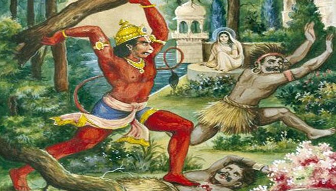 அஹங்காரம் கண்ணை மறைக்க “எங்களை யாரும் ஒன்றும் செய்துவிட முடியாது” என்று திமிருடன் சுற்றிக்கொண்டு திரிந்தவர்கள் ராவண சேனை. அனுமன் என்றொருவன் வந்தான், அவர்களின் திமிரை அடக்க. அவர்கள் இடத்துக்கே சென்று மிரட்டுகிறான்.