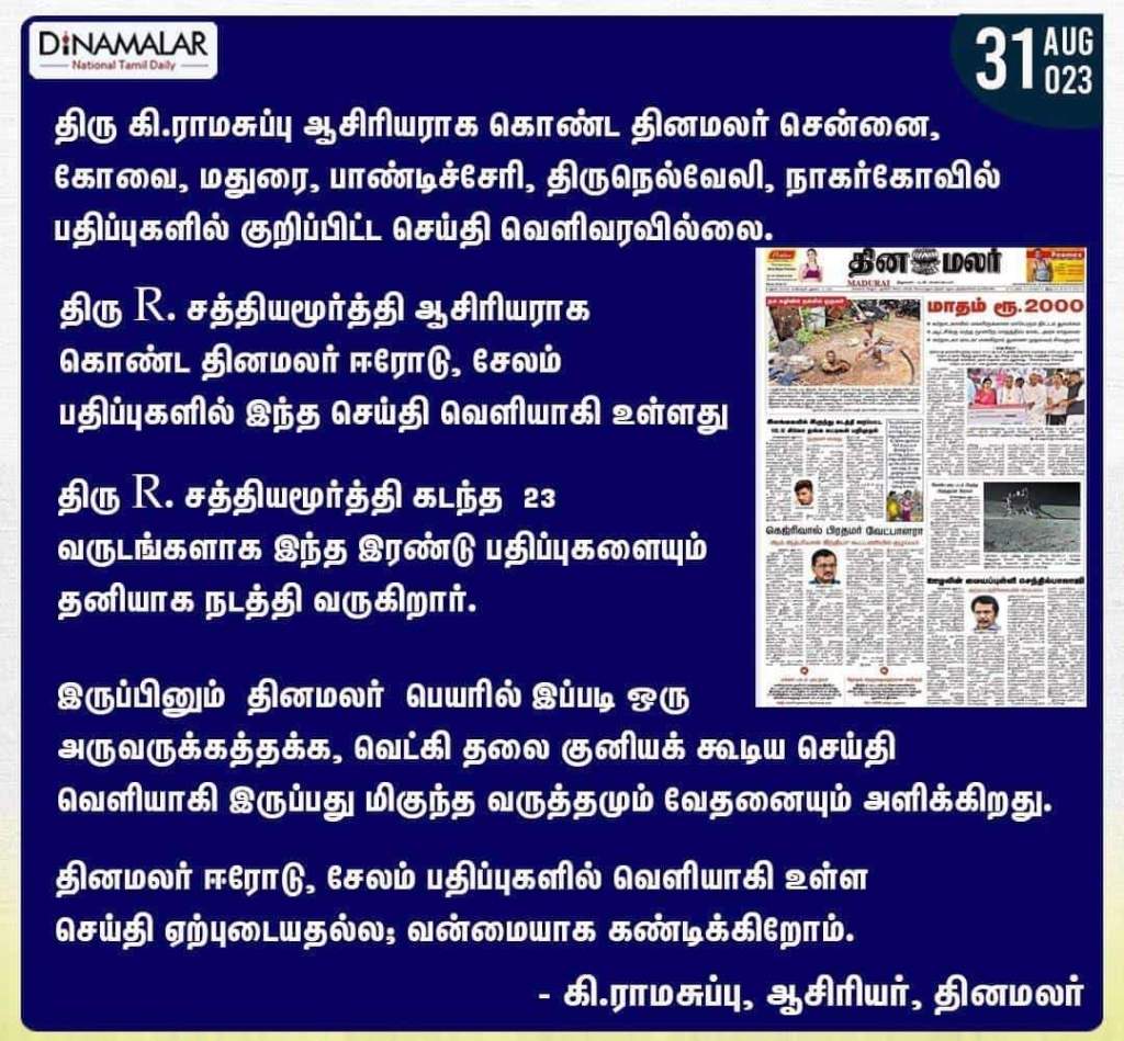 தினமலர் நாளிதழின் ஈரோடு, சேலம் பதிப்புகளில் 31.08.2023 அன்று முதல் பக்கத்தில் வெளியான செய்தி ஒன்று, தமிழகத்தில் பெரும் சர்ச்சையை உருவாக்கியிருப்பதுடன், இங்கு நீண்டகாலமாக கடைப்பிடிக்கப்படும் பிராமண வெறுப்பையும் ஊதிப் பெரிதாக்கி இருக்கிறது. உச்சகட்டமாக, தினமலரை ‘தினமனு’ என்று குறிப்பிட்டு கண்டித்திருக்கிறார் முதல்வர் திரு. மு.க.ஸ்டாலின். அதாவது, எப்போதோ வழக்கொழிந்துவிட்ட மனுஸ்மிருதியே தினமலரின் இந்த தவறான தலைப்புச் செய்திக்குக் காரணம் என்கிறார் முதல்வர். கூடவே சநாதனத்தையும் சாடுகிறார். இவர் ‘சநாதனம்’ என்று எதனை எண்ணிக் கொண்டிருக்கிறார் என்பது புரியவில்லை. இவரது அடியொற்றி, தமிழகம் முழுவதும் அன்று ஒருநாள் முழுவதும் பிராமணர்கள் கரித்துக் கொட்டப்பட்டார்கள்.