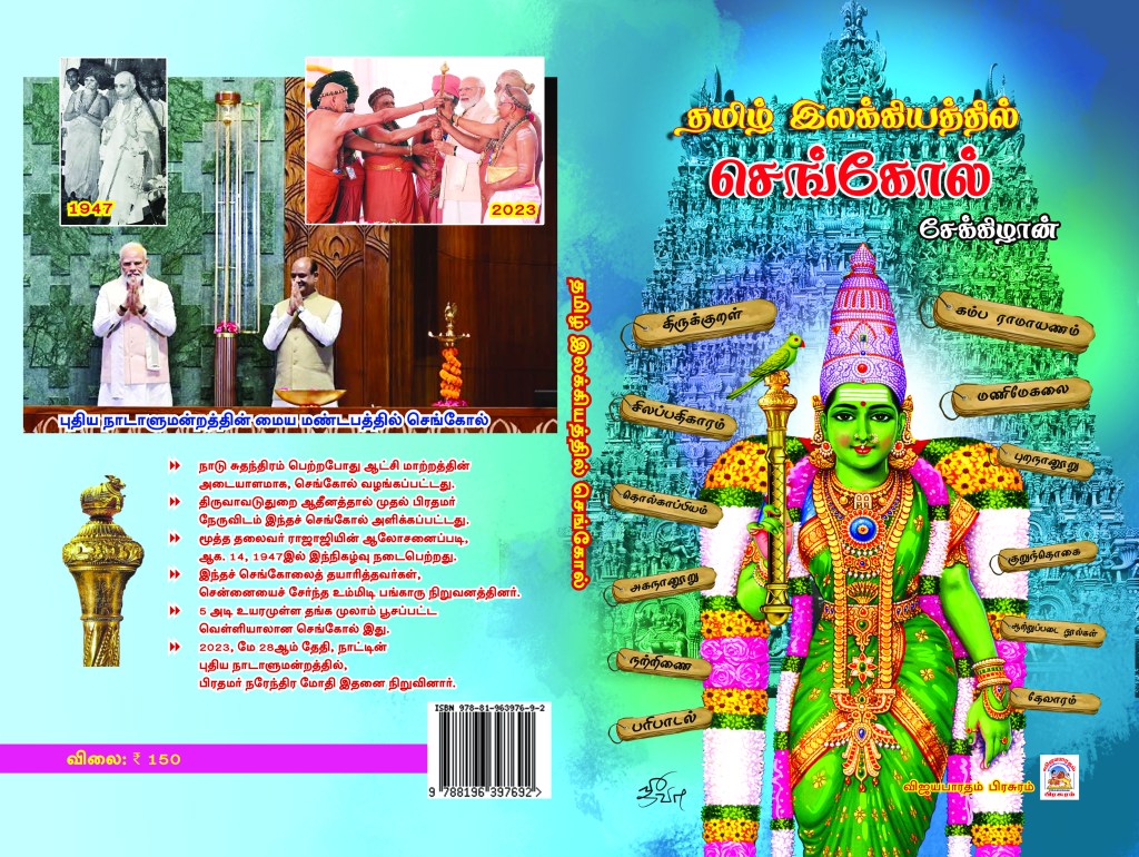 இவற்றில், நாட்டு மக்கள் நலன் விரும்பும் நல்லாட்சியை அளித்த நாயகர்களின் சின்னமாக விளங்கிய ‘செங்கோல்’ குறித்து தமிழ் இலக்கிய நூல்களில் பயின்று வரும் செய்திகளைத் தொகுத்து இனிய நூலாக வழங்கி இருக்கிறார் திரு. சேக்கிழான். அவருக்கு நமது பாராட்டுகள்.
