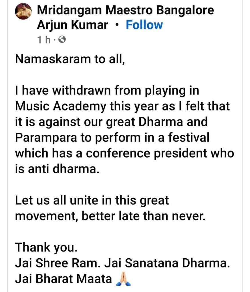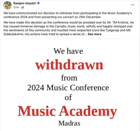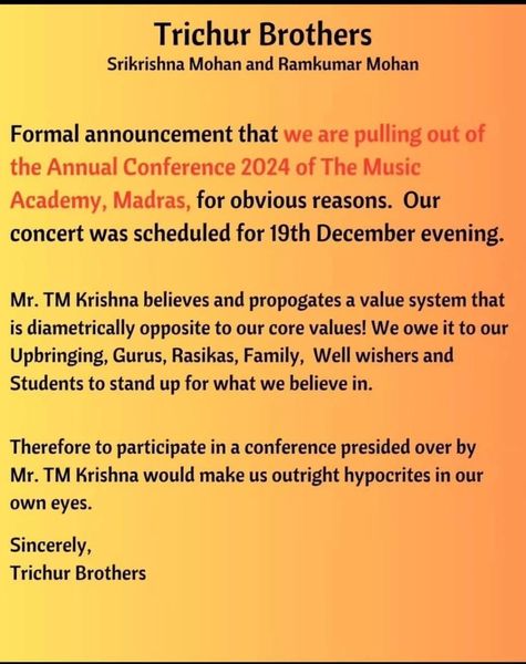 சென்னை மியூசிக் அகாடமியின் 2024ஆம் ஆண்டுக் கூட்டத்தில் இருந்து வெளியேறுகிறோம். எங்களது நிகழ்ச்சி டிச. 19இல் நடைபெற இருந்தது. நமது நம்பிக்கைகள் மற்றும் முக்கிய மாண்புகளுக்கு முற்றிலும் எதிரானவற்றை டி.எம்.கிருஷ்ணா பரப்புகிறார். டி.எம்.கிருஷ்ணா தலைமையில் நடக்கும் கூட்டத்தில் பங்கேற்றால், எங்கள் நம்பிக்கைகள் போலித்தனமானதாக இருக்கும் – இவ்வாறு அவர்கள் கூறியுள்ளனர்.