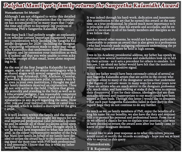 ‛‛மியூசிக் அகாடமியின் 2024ஆம் ஆண்டு கூட்டத்திலும், டிச. 25 இல் நடக்கும் இசை நிகழ்ச்சியிலும் இருந்து விலகிக் கொள்கிறோம். டி.எம்.கிருஷ்ணா தலைமையில் கூட்டம் நடப்பதால் இந்த முடிவை எடுத்துள்ளோம். அவர் கர்நாடக இசைக்கலைக்கு பெரும் சேதத்தை ஏற்படுத்தி வருவதுடன், வேண்டுமென்றே இசை சமூகத்தின் உணர்வுகளை மிதித்து வருகிறார். மரியாதைக்குரிய ஆளுமைகளான தியாகராஜர், எம்.எஸ்.சுப்புலட்சுமி ஆகியோரை அவமதித்தவர் அவர். கர்நாடக இசைக்கலைஞராக இருப்பது அவமானத்திற்குரியது என்ற உணர்வைப் பரப்ப முயன்றார். இசையில் ஆன்மிகத்தை இழிவுபடுத்தும் வகையிலும் பேசி வருகிறார்.