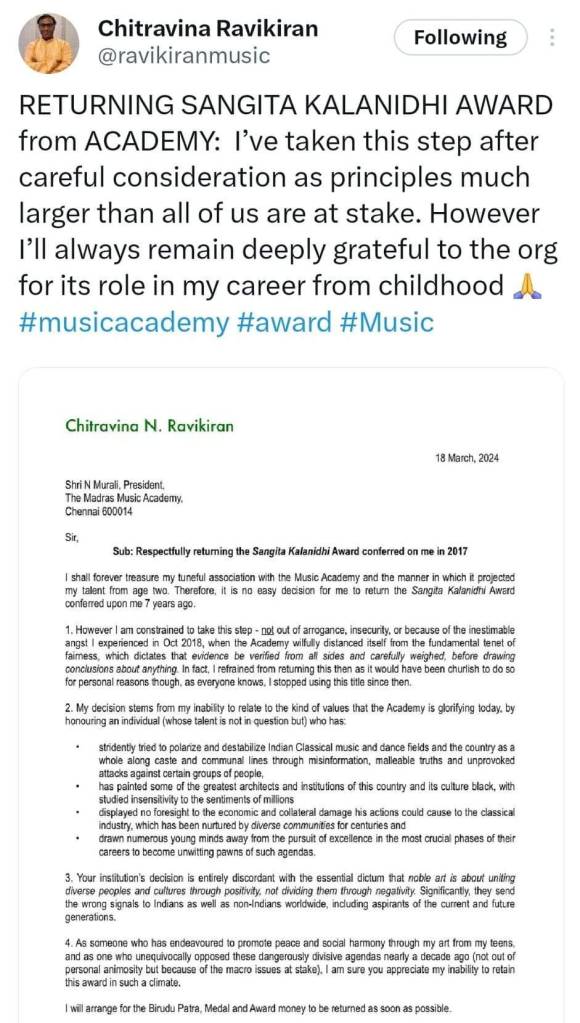 சித்ரவீணை ரவிகிரண் வெளியிட்ட அறிக்கையில், “மியூசிக் அகாடமி வழங்கிய சங்கீத கலாநிதி விருதை திருப்பித் தர முடிவு செய்துள்ளேன். எதையும் விட கொள்கை முக்கியம் என்பதால், நன்கு பரிசீலனை செய்து இந்த முடிவை எடுத்துள்ளேன். குழந்தைப் பருவத்தில் இருந்து எனக்கு ஆதரவு அளித்த அமைப்பிற்கு என்றும் நன்றியுடன் இருப்பேன்” என்று கூறியுள்ளார். இவரும் தனது கண்டனத்தை மியூசிக் அகாடமி தலைவருக்கு (த ஹிண்டு – என்.முரளி) எழுதியுள்ளார். (கீழே)…