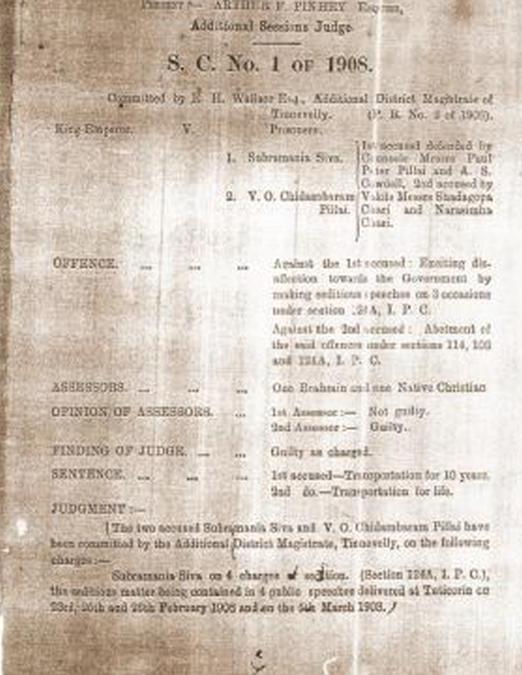 சென்ற நூற்றாண்டின் தொடக்கத்தில் தென்னிந்தியாவில் சுடர்விட்ட சுதேசிய எழுச்சியின் அடையாளம் தான் நெல்லைக் கலகம். அந்த வழக்கில் விடுதலைவீரர் வ.உ.சிதம்பரம் பிள்ளைக்கு வழங்கப்பட்ட இரட்டை ஆயுள் தண்டனைத் தீர்ப்பு (07/07/1908) வரலாற்று முக்கியத்துவம் வாய்ந்தது. அது குறித்து சென்னை வளர்ச்சி ஆய்வு நிறுவனத்தின் நூலகர் திரு. ரெங்கையா முருகன் முகநூலில் எழுதிய பதிவு இது…