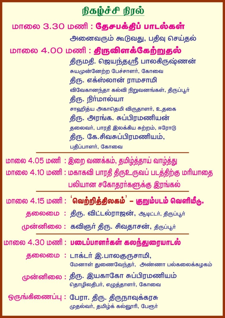 இந்நிகழ்வில், கொங்கு மண்டலத்தைச் சார்ந்த கோவை, ஈரோடு, நீலகிரி, திருப்பூர் ஆகிய மாவட்டங்களில் உள்ள எழுத்தாளர்கள், ஓவியர்கள், கலைஞர்கள், சிந்தனையாளர்கள் உள்ளிட்ட படைப்பாளர்கள் பல பங்கேற்கவுள்ளனர்.