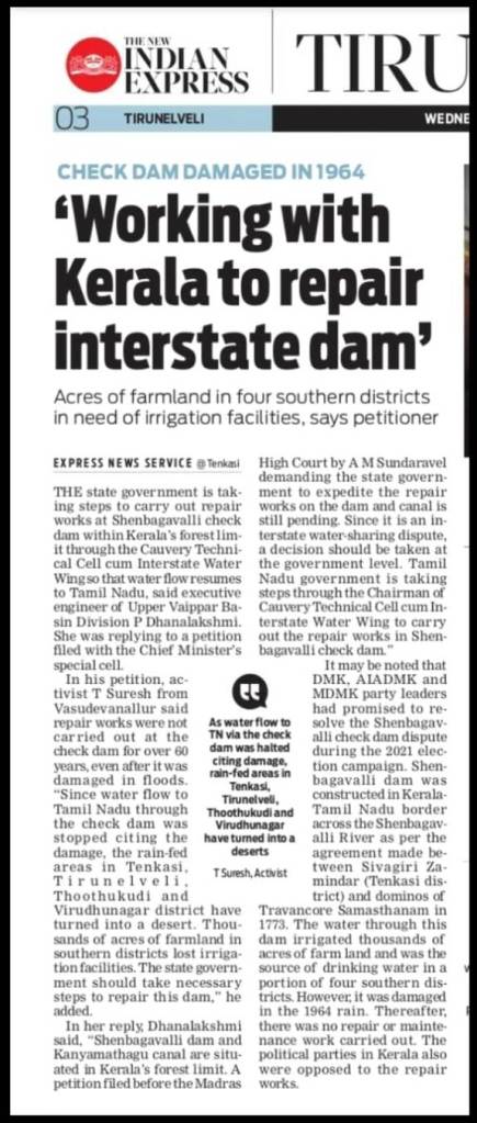 அவர்களின் தனிச்சிறப்பு மேற்பார்வையில் உடைந்து போன செண்பகவல்லி தடுப்பணையை மீண்டும் சரி செய்ய வேண்டும். அதற்கான கட்டுமானத் தொகைக்கு, நான்கு மாவட்டத்தில் வாழும் மக்களும் நபர் ஒன்றுக்கு ரூபாய் 1 மட்டும் வசூல் செய்து ஆக்கப்பூர்வமான அனுமதியை மத்திய அரசு அளிக்க வேண்டும்.
