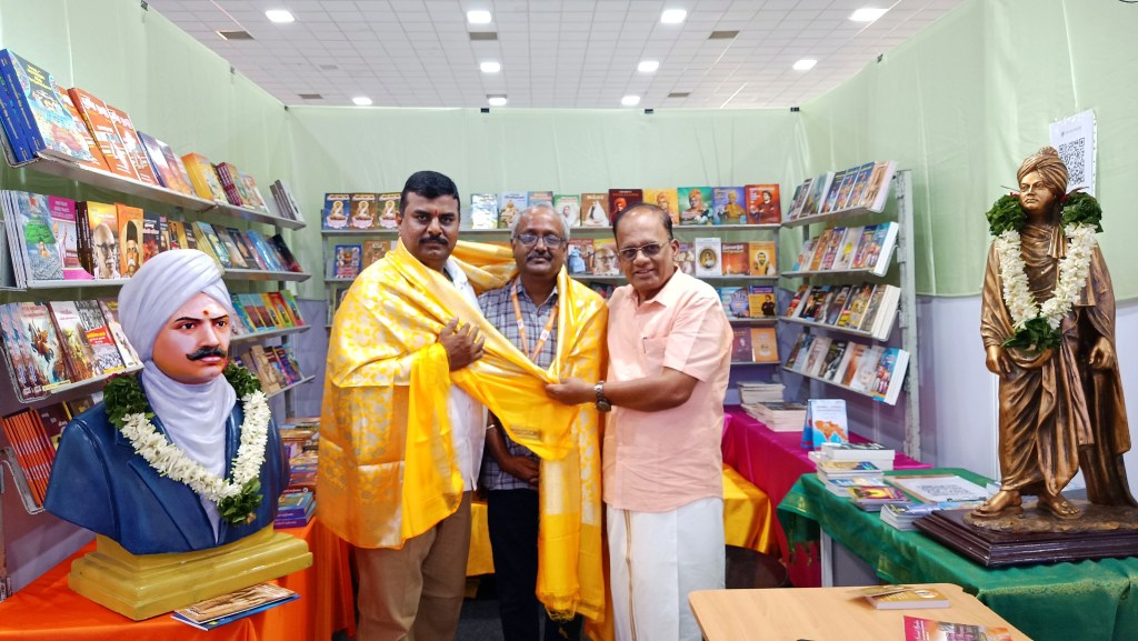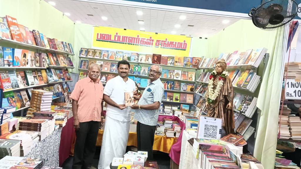 புத்தகத் திருவிழாவில் அரஙு அமைத்ததற்காக, படைப்பாளர்கள் சங்கம நிர்வாகிகளை கௌரவிக்கும் வேளாண்மை பல்கலைக்கழக பேராசிரியர் (ஓய்வு) திரு. விஜயராகவன்.