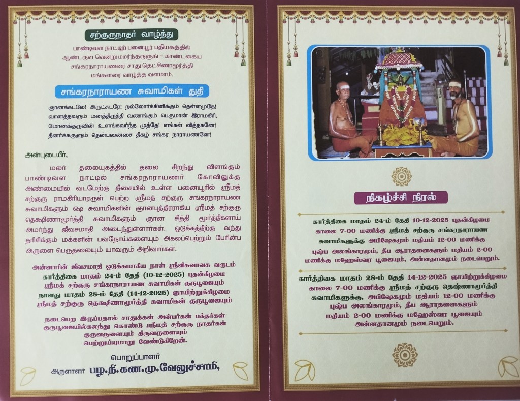 தெய்வீகத்திலும், இலக்கியத்திலும் சிறப்புப் பெற்ற இத்தலத்தில், ஒரு சுபயோக சுப தினத்தில் 1835 இல் கார்த்திகை மாதம் 24 ஆம் தேதி, புனர்பூச நட்சத்திர தினத்தில் சற்குரு சங்கரநாராயண சுவாமிகளும், அவரது திருமகனாராகிய தெட்சணாமூர்த்தி சுவாமிகள் 1890இல் கார்த்திகை மாதம் 27 ஆம் தேதி (நள்ளிரவு)அனுஷம் நட்சத்திர தினத்திலும், ஆன்மாக்கள் யாவரும் உய்வு பெரும் பொருட்டு , உலக மக்கள் யாவரும் நலம் பெறும் பொருட்டு ஜீவ சமாதி கொண்டு அருளினார்கள். அன்றிலிருந்து ஒவ்வொரு கார்த்திகை மாதம் 24, 28 ஆம் நாளில் குருபூஜை வைபவம் வெகு சிறப்பாக நடைபெற்று வருகிறது.