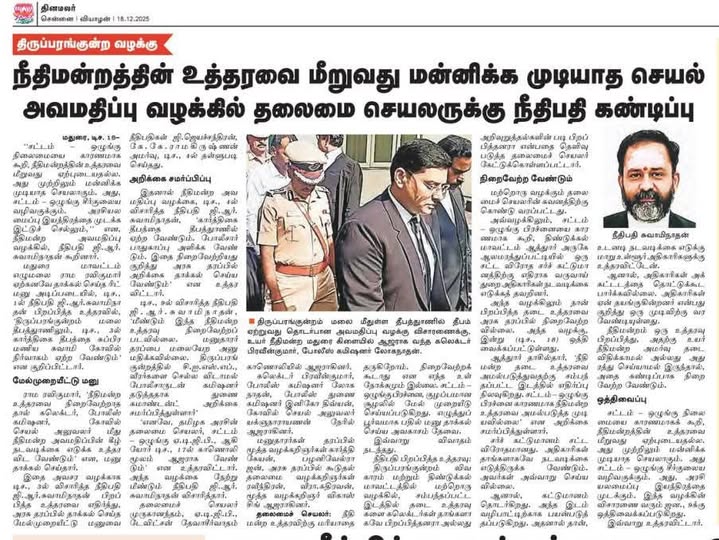 திருப்பரங்குன்றம் தீப வழக்கு உத்தரவை நிறைவேற்றாததால் மதுரை ஆட்சியர், காவல் ஆணையர், துணை ஆணையர், கோயில் செயல் அலுவலர் ஆகியோருக்கு எதிராகத் தொடர்ந்த நீதிமன்ற அவமதிப்பு மனு நீதிபதி ஜி.ஆர்.சுவாமிநாதன் முன்னிலையில் விசாரணையில் உள்ளது.