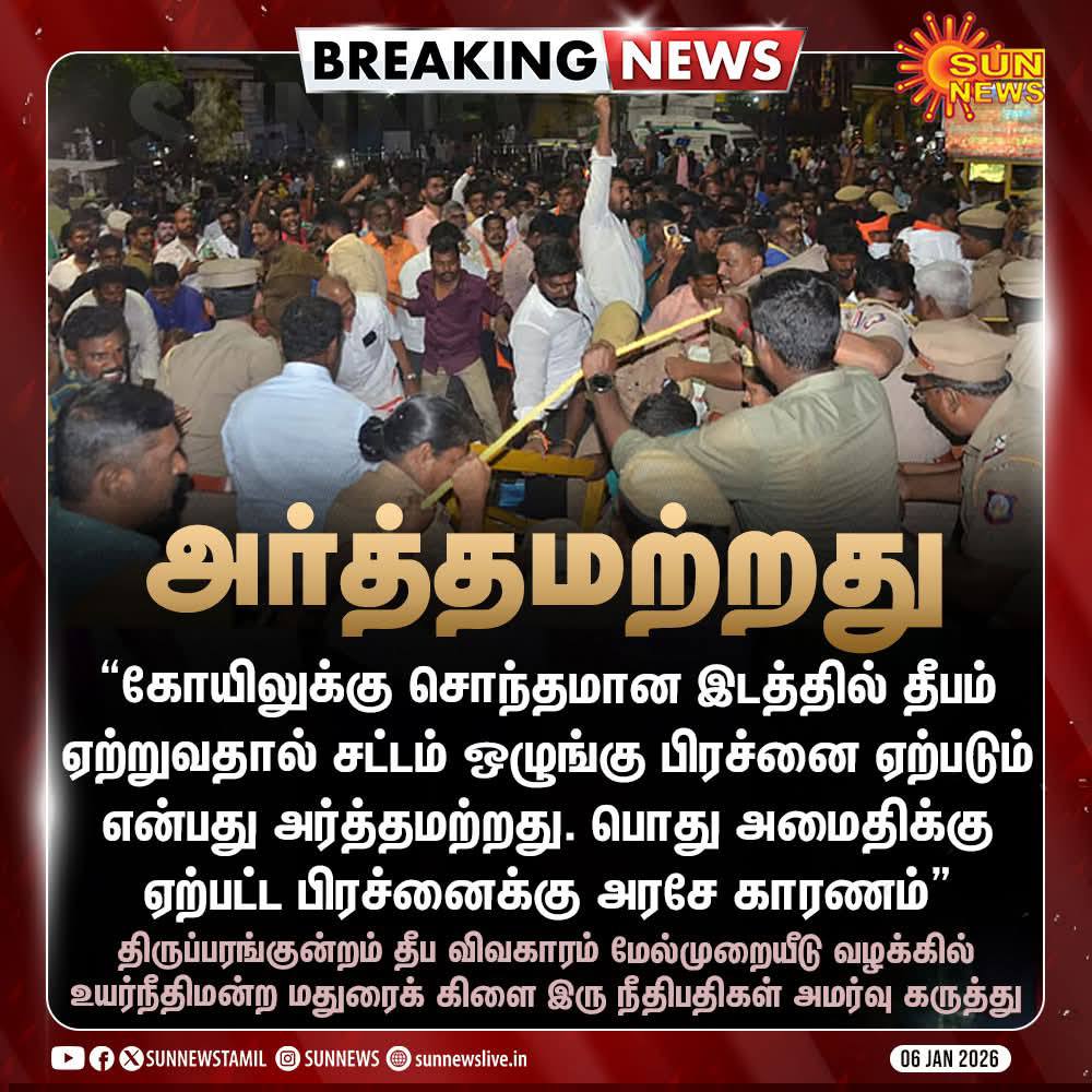 திருப்பரங்குன்றத்தில் பொது அமைதிக்கு குந்தகம் ஏற்படும் என்று தமிழக அரசின் வாதம் தவறு. அப்படி ஏற்பட்டால் அதற்கு தமிழக அரசே காரணம். கோயிலுக்குச் சொந்தமான இடத்தில் தீபம் ஏற்றுவது பொது அமைதியை சீர்குலைக்கும் என்பது அபத்தமானது.