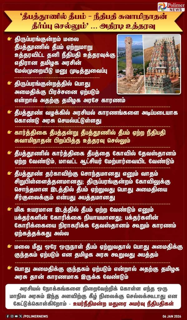 திருப்பரங்குன்றம் மலை உச்சியில் தேவஸ்தானம் தீபம் ஏற்ற வேண்டும் என்று சென்னை உயர் நீதிமன்ற மதுரை கிளை, ஜன. 6, 2025, செவ்வாய்க்கிழமையன்று உத்தரவிட்டுள்ளது. மேலும், தீபம் இருக்கும் இடம் கோயில் நிர்வாகத்துக்கே (இந்துக்களுக்கே) சொந்தமானது என்றும் மேல் முறையீட்டு வழக்கில் தெரிவிக்கப்பட்டுள்ளது.