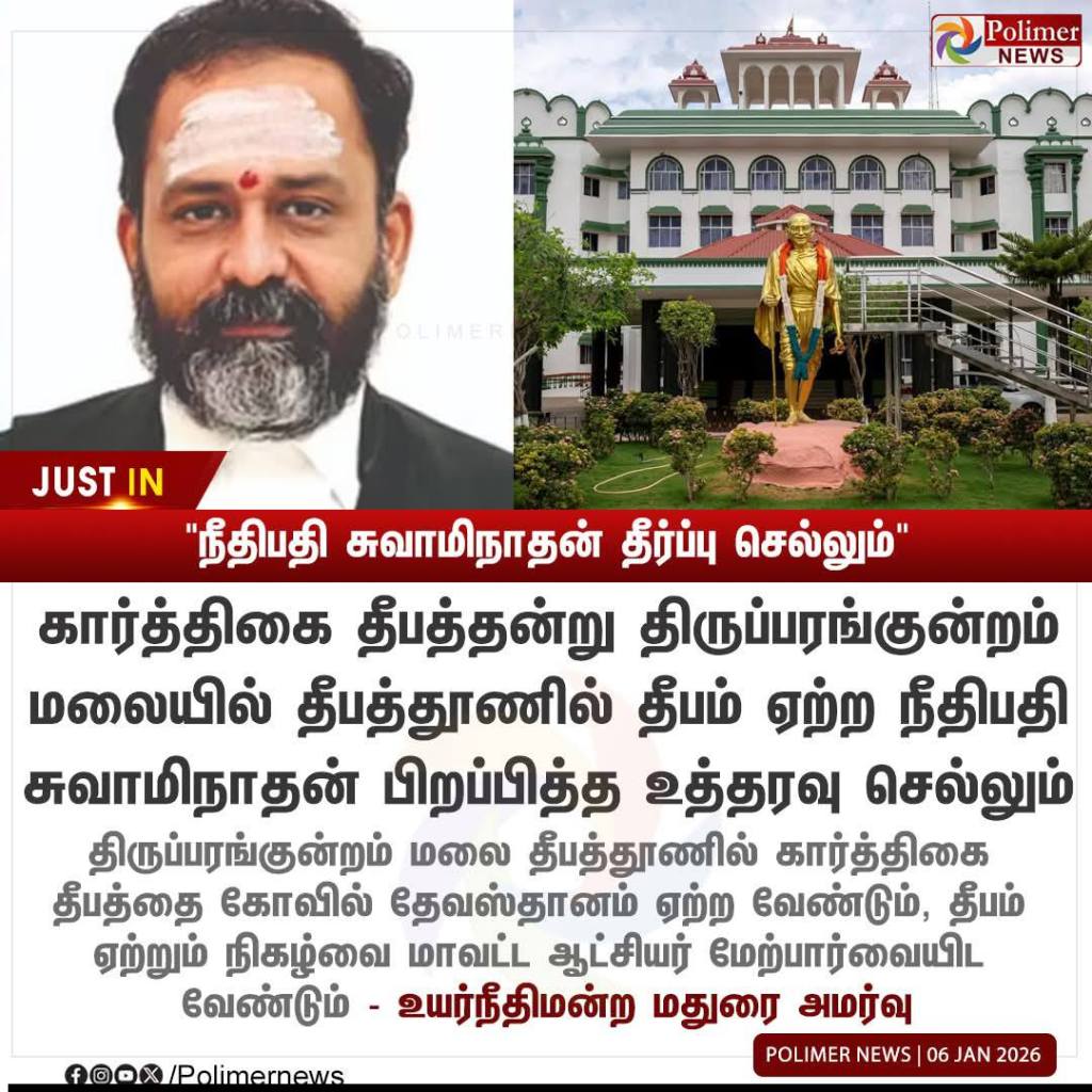 மதுரை எழுமலையைச் சோ்ந்த ராம. ரவிக்குமார், திருப்பரங்குன்றம் மலை உச்சியில் உள்ள தூணில் கார்த்திகை தீபம் ஏற்ற உத்தரவிடக் கோரி, சென்னை உயா்நீதிமன்ற மதுரை அமா்வில் மனு தாக்கல் செய்தார். அந்த மனுவை விசாரித்த உயா்நீதிமன்ற நீதிபதி ஜி.ஆா். சுவாமிநாதன், திருப்பரங்குன்றம் மலை உச்சியில் உள்ள தூணில் கார்த்திகை திருநாளன்று தீபம் ஏற்ற உத்தரவிட்ட நிலையில் (டிச. 5), கோயில் நிர்வாகம் தீபம் ஏற்றவில்லை.