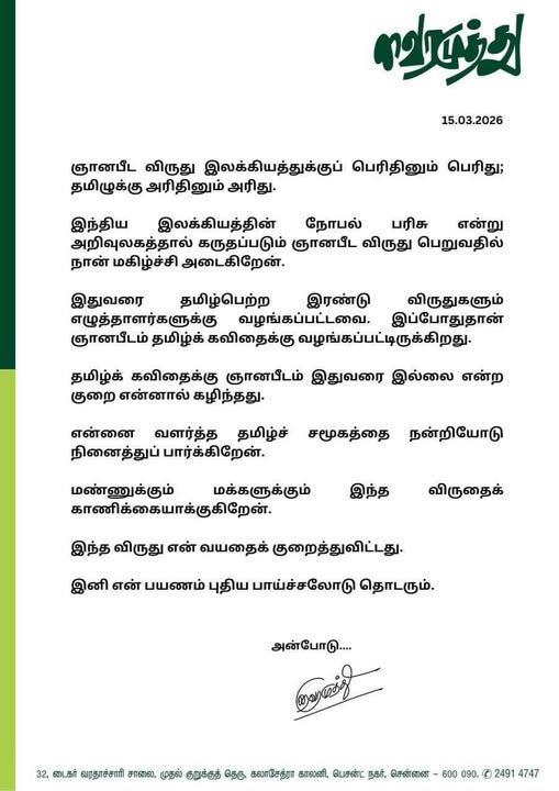தேர்வுக் குழுவினர் யார்? ‘பாரதிய ஞான பீடம்’ (Bharatiya Jnanpith Award) பாரதத்தில் இலக்கியத்துக்காக வழங்கப்படும் ஓர் உயரிய தனியார் விருது ஆகும். இந்த விருதை பாரதிய ஞானபீடம் என்ற பண்பாட்டு இலக்கியக் கழகத்தினர் வழங்குகின்றனர். இந்த அறக்கட்டளை தி டைம்ஸ் ஆஃப் இந்தியா நாளிதழை வெளியிடும் சாஹு ஜெயின் குடும்பத்தினரால் 1961இல் நிறுவப்பட்டது. 1965ஆம் ஆண்டுமுதல் இவ்விருது வழங்கப்பட்டு வருகிறது. கவிஞர் வைரமுத்து அவர்களுக்கு 60-வது ஞானபீட விருது (2025-ஆம் ஆண்டிற்கானது) அறிவிக்கப்பட்டுள்ளது என்ற செய்தி மார்ச் 14 ஆம் தேதி வெளியானது. தமிழில் கவிஞர் வைரமுத்து அவர்களின் ஒட்டுமொத்த இலக்கியப் பங்களிப்பிற்காக (Outstanding contribution to Indian Literature) இந்த விருது வழங்கப்பட்டுள்ளது. குறிப்பாக, நாவல்கள் மற்றும் கவிதைகள் மூலம் தமிழ் இலக்கியத்திற்கு அவர் ஆற்றிய பணிகளுக்காக (கள்ளிக்காட்டு இதிகாசம், கருவாச்சி காவியம், தண்ணீர் தேசம் போன்றவை) இந்த கௌரவம் அளிக்கப்பட்டுள்ளது. பாரதீய ஞானபீட அமைப்பின் தேர்வு வாரியம் (Selection Board) இந்த முடிவை எடுத்தது. இக்குழுவில் இடம்பெற்ற முக்கிய நபர்கள்: தலைவர்: திருமதி. பிரதிபா ராய் (பிரபல எழுத்தாளர்) உறுப்பினர்கள்: மாதவ் கௌஷிக், தாமோதர் மௌசோ, சுரஞ்சன் தாஸ், ஏ.கிருஷ்ணா ராவ், பிரபுல்ல ஷிலேதர், கேசுபாய் தேசாய், ஜானகி பிரசாத் சர்மா, கே. சீனிவாஸ் ராவ், மகேஸ்வர். தமிழிலிருந்து பரிந்துரைக்கப்பட்ட பட்டியலைப் பரிசீலித்து தேர்வு செய்வது மட்டுமே இவர்களின் பணி. திருவாளர் வைரமுத்துவைப் பரிந்துரைத்த அந்த அதிமேதாவி யாரென்று தான் தெரியவில்லை. (ஒரு மூத்த பத்திரிகை ஆசிரியர் பரிந்துரைத்ததாகவும், அதை துணை ஜனாதிபதி சிபாரிசு செய்ததாகவும் வரும் தகவல்கள் உண்மையா என்று தெரியவில்லை). காண்க: ஞானபீடம் (விக்கி)