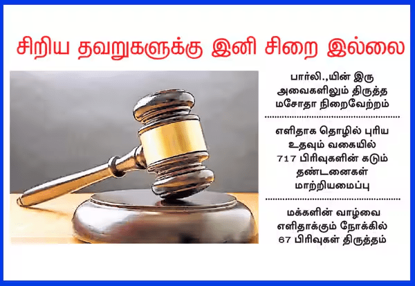 இது சுதந்திர இந்தியாவில் மிகப் பெரிய சட்ட சீர்திருத்தம் ஆகும். இதன்மூலமாக, நாடு முழுவதும் தேக்கமடைந்துள்ள 4.8 கோடி வழக்குகள் மறு ஆய்வு செய்யப்பட்டு விரைவில் எளிய முறையில் தீர்வு காணப்படும். இதன்மூலம் இனிமேல் சிறு குற்றங்கள், விதிமீறல்கள் அனைத்தும் குற்றமற்றதாகவே கருதப்படும்.