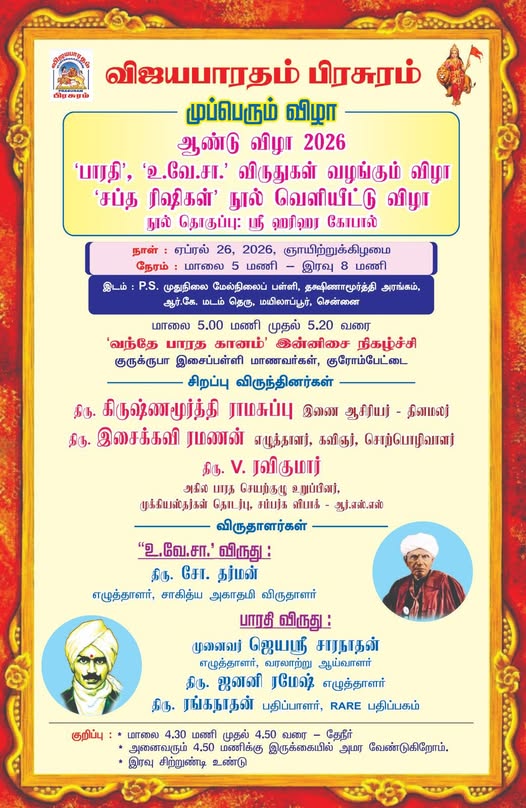 விஜயபாரதம் பிரசுரத்தின் மூன்றாம் ஆண்டுவிழா, சென்னையில் 26.04.2026, ஞாயிற்றுக்கிழமை மாலை நடைபெறுகிறது. இடம்: தட்சிணாமூர்த்தி அரங்கம், பி. எஸ். மேல்நிலைப் பள்ளி, மயிலாப்பூர், சென்னை.